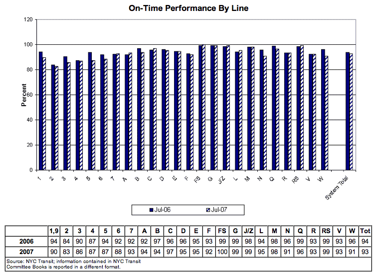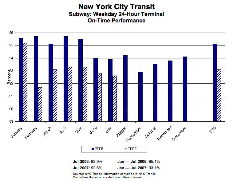 The oldest lines appear to be the most unreliable (no shock there). If you notice, though, the reliability has declined year to year. For the 1 thru 6 lines, running at 80-90% on time is a bit embarrassing. Sure, this is just one month (July), but that doesn’t make the situation any better.